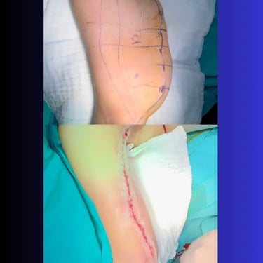 During the procedure, skin is removed in a long ellipse shape from the back of the elbow, along the line between the inside and back of the arm, curving into the armpit.